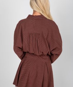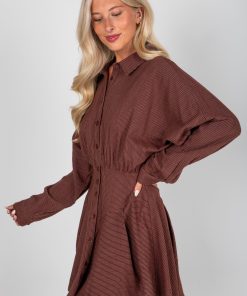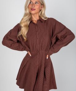 Elevate your everyday style with the Everything In Place Brown Pinstripe Mini Dress! Featuring a classic pinstripe pattern in a rich brown hue, this dress combines professional polish with modern flair. The drop waist silhouette creates a flattering, relaxed fit, while the button-up front and collared neckline add timeless shirt dress appeal. Perfect for the office, brunch, or casual outings, this versatile dress pairs effortlessly with boots, flats, or heels for a look that’s both chic and comfortable! Lightweight Cotton-Blend Fabrication Striped Print Collared Neckline Functional Button Front Long Drop Sleeves with Functional Button Cuffs Drop Waist Flowy Fit Short/Mini Length 70% Rayon, 18% Nylon, 12% Linen Dry Clean Only Models are 5’4″ + 5’6″ and are wearing a Small.Garment Measurements in Inches:Small | Bust 48″ | Waist 26″ | Hips 36″ | Length 32″Medium | Bust 50″ | Waist 28″ | Hips 38″ | Length 33″Large | Bust 52″ | Waist 30″ | Hips 40″ | Length 34″
