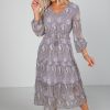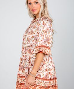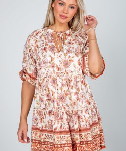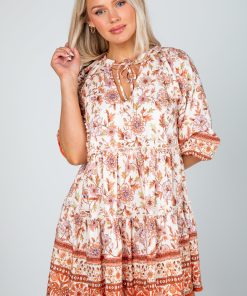 Step into effortless charm with the Fresh Perspective Ivory Floral Tiered Mini Dress! Decorated with a rustic floral print in warm rust tones, this dress is the perfect blend of sweet and seasonal. The tiered silhouette adds playful movement, while the long sleeves bring balance and a touch of elegance. Finished in a flattering mini length, it’s a versatile piece you can dress up with heels or keep casual with boots. Perfect for fall outings, brunch dates, or any occasion where you want to look chic and feel comfortable! Lightweight Woven Knit Fabrication Floral Print Rounded Neckline with Functional Tie + Keyhole Long Flounce Sleeves with Elastic Cuffs Flowy Tiered Fit Short/Mini Length Lined Body, Unlined Sleeves Self: 90% Rayon, 10% Nylon Lining: 100% Polyester Hand Wash Cold, Lay Flat to Dry Models are 5’6″ + 5’8″ and are wearing a Small.Garment Measurements in Inches:Small | Bust 34” | Waist 34” | Hips 46” | Length 34”Medium | Bust 36” | Waist 36” | Hips 48” | Length 35”Large | Bust 38” | Waist 38” | Hips 50” | Length 36”