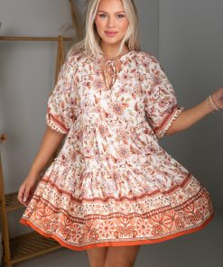 Step into effortless charm with the Fresh Perspective Ivory Floral Tiered Mini Dress! Decorated with a rustic floral print in warm rust tones, this dress is the perfect blend of sweet and seasonal. The tiered silhouette adds playful movement, while the long sleeves bring balance and a touch of elegance. Finished in a flattering mini length, it’s a versatile piece you can dress up with heels or keep casual with boots. Perfect for fall outings, brunch dates, or any occasion where you want to look chic and feel comfortable! Lightweight Woven Knit Fabrication Floral Print Rounded Neckline with Functional Tie + Keyhole Long Flounce Sleeves with Elastic Cuffs Flowy Tiered Fit Short/Mini Length Lined Body, Unlined Sleeves Self: 90% Rayon, 10% Nylon Lining: 100% Polyester Hand Wash Cold, Lay Flat to Dry Models are 5’6″ + 5’8″ and are wearing a Small.Garment Measurements in Inches:Small | Bust 34” | Waist 34” | Hips 46” | Length 34”Medium | Bust 36” | Waist 36” | Hips 48” | Length 35”Large | Bust 38” | Waist 38” | Hips 50” | Length 36”