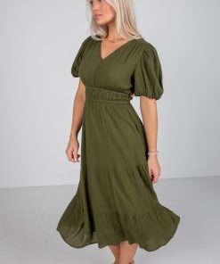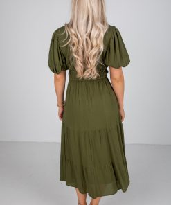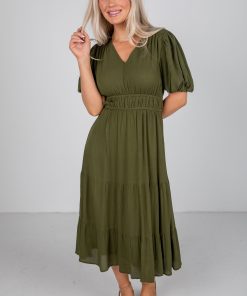 Embrace effortless style in the Have The Best Time Olive Midi Dress! Featuring romantic puff sleeves and a tiered, flowy silhouette, this dress moves gracefully with every step. The soft olive hue adds a timeless, versatile touch, while the maxi length creates a flattering, elongating look. Perfect for brunches, garden parties, or casual outings, pair it with sandals for a relaxed vibe or dress it up with heels and accessories for a polished, feminine ensemble! Lightweight Woven Knit Fabrication V-Neckline Short Puff Sleeves with Elastic Cuffs Elastic Waistband Flowy Tiered Fit Midi Length Fully Lined Self: 100% Rayon Lining: 100% Polyester Hand Wash Cold, Hang or Line Dry Model is 5’6″ and wearing a Small.Garment Measurements in Inches:Small | Bust 38″ | Waist 28″ (Stretches up to 32″) | Hips 48″ | Length 46″Medium | Bust 40″ | Waist 30″ (Stretches up to 34″) | Hips 50″ | Length 47″Large | Bust 42″ | Waist 32″ (Stretches up to 36″) | Hips 52″ | Length 48″X-Large | Bust 44″ | Waist 34″ (Stretches up to 38″) | Hips 54″ | Length 49″