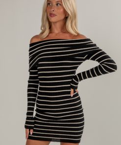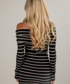 The Perfectly Classic Black Striped Off-The-Shoulder Knit Mini Dress is a chic and flirty wardrobe standout! Crafted from soft, stretchy ribbed knit fabric, this dress features a flattering off-the-shoulder neckline and long sleeves for a stylish, modern silhouette. The classic black and white stripes add timeless visual interest, while the mini length hits above the knee for a playful, feminine look. Perfect for date nights, casual outings, or layering with jackets and boots, this dress combines comfort and fashion effortlessly! Soft + Stretchy Ribbed Knit Fabrication Off-The-Shoulder Neckline with Overlay Long Sleeves Bodycon Fit Short/Mini Length 57% Acrylic, 28% Polyester, 15% Nylon Hand Wash Cold, Lay Flat to Dry Model is 5’4″ and wearing a Small.Garment Measurements in Inches:Small | Bust 24” | Waist 18” | Hips 20” | Length 32”Medium | Bust 26” | Waist 20” | Hips 22” | Length 32.5”Large | Bust 28” | Waist 22” | Hips 24” | Length 33”