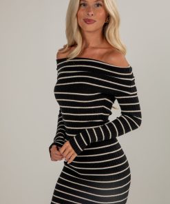 Perfectly Classic Black Striped Off-The-Shoulder Knit Mini Dress
