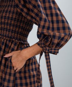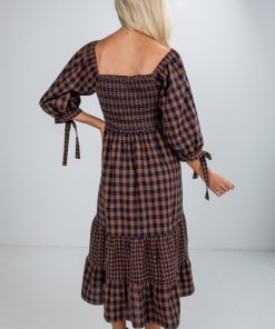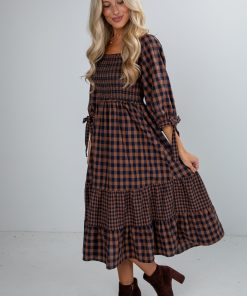 Bring cozy charm to your wardrobe with the Show Me The Way Navy Gingham Smocked Midi Dress! Crafted from a lightweight, flowy fabric, it features a flattering smocked bodice that stretches to fit comfortably while accentuating your shape. The tiered skirt adds playful movement, and the classic gingham pattern in warm rust and navy tones gives it a timeless, seasonal appeal. With long sleeves and a modest midi length, this dress is perfect for brunches, fall outings, or weekend gatherings. Pair it with boots or flats for an effortlessly chic, polished look! Lightweight Cotton Fabrication Gingham Print Smocked Bust Elastic Square Neckline Elastic Shoulders 3/4 Length Sleeves with Functional Tie Cuffs Smocked Bust Elastic Waistband Flowy Tiered Fit Side Pockets Midi Length 100% Cotton Hand Wash Cold, Hang or Line Dry Model is 5’6″ and wearing a Small.Garment Measurements in Inches:Small | Bust 26″ (Stretches up to 32″) | Waist 26″ (Stretches up to 32″) | Hips 48″ | Length 45″Medium | Bust 28″ (Stretches up to 34″) | Waist 28″ (Stretches up to 34″) | Hips 50″ | Length 45.5″Large | Bust 30″ (Stretches up to 36″) | Waist 30″ (Stretches up to 36″) | Hips 52″ | Length 46″