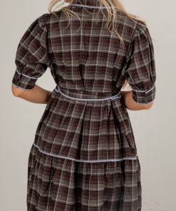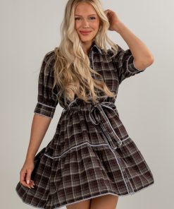 The Showing You My Best Charcoal Plaid Mini Dress is the perfect blend of cozy charm and flirty style! Crafted from soft, lightweight fabric, this dress features a flattering tiered silhouette that adds movement and volume, while the tie belt cinches the waist for a polished, feminine fit. The classic charcoal plaid pattern gives it a timeless, versatile appeal, making it ideal for both casual days and dressier occasions. Pair it with boots or heels for an effortlessly chic look that’s ready for the season! Lightweight Woven Knit Fabrication Plaid Print Collared Neckline Functional Button Front Short Puff Sleeves with Functional Button Cuffs Functional Tie Belt Flowy Tiered Fit Side Pockets Short/Mini Length Self: 90% Polyester, 5% Rayon, 5% Spandex Contrast: 100% Cotton Hand Wash Cold, Hang or Line Dry Model is 5’6″ and wearing a Small.Garment Measurements in Inches:Small | Bust 46″ | Waist 44″ | Hips 66″ | Length 35.5″Medium | Bust 48″ | Waist 46″ | Hips 68″ | Length 36″Large | Bust 50″ | Waist 48″ | Hips 70″ | Length 37″